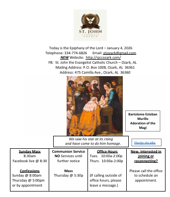 Thank you for visiting St. John Catholic Church - a small, but growing, multi-cultural Catholic Community serving the Dale County area. Visitors also find us as they travel to and from the Gulf Coast on vacation or business. Soldiers from the Fort Rucker community and their families become a part of our parish during their tours of duty and training. All are welcome to join us for any Mass or parish event.