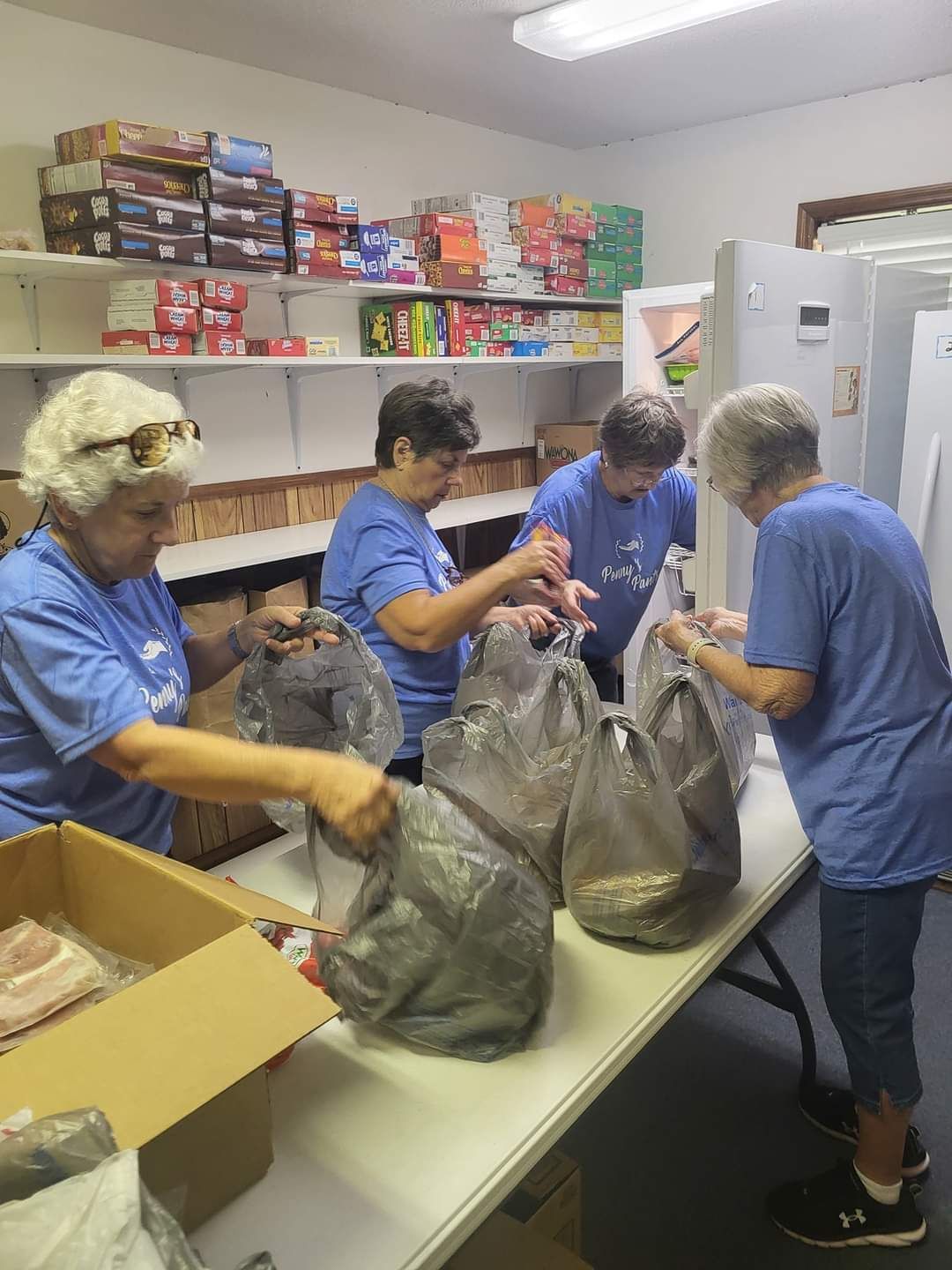 Volunteers prepare bags of food for distribution to the needy in our community on the first Friday of the month. For more information contact the church office.